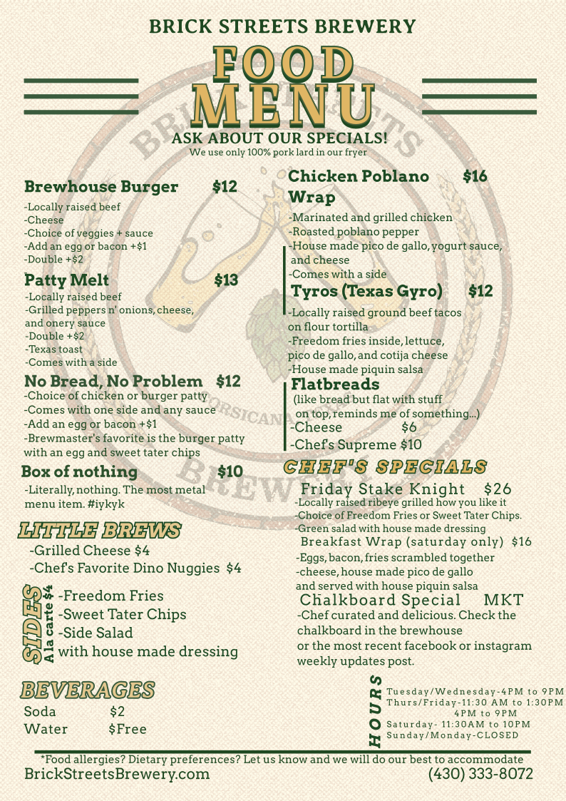 There’s never a dull day at Brick Streets Brewery—and if you’re wondering what’s on tap for the week, just take a look at the image next to this post! From crowd-favorite nights to one-of-a-kind pours, we’ve lined up something worth toasting every single day.